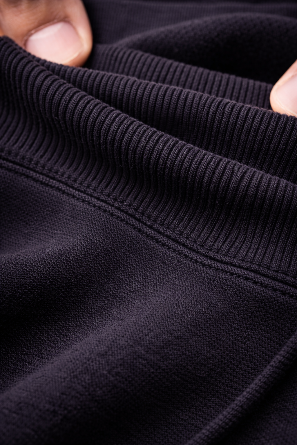 The 10 oz heavyweight cotton fleece provides density and structure that holds its form throughout the life of the garment. The fabric drapes with intention, maintaining clean lines through the shoulders and body while resisting the sag and collapse common in lighter fabrics.